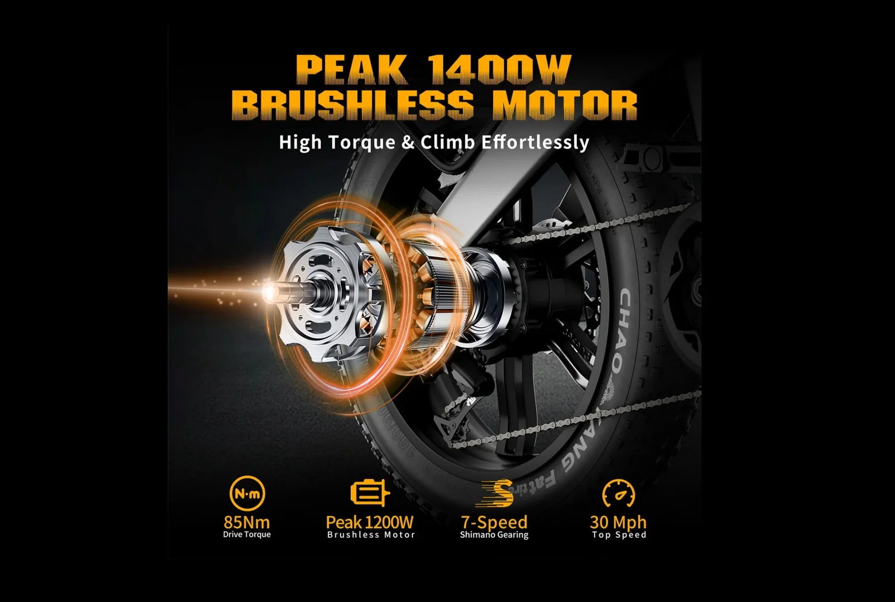 Motor:Â 1400W (peak), 750W (sustained), 48V BAFANG Brushless Rear Hub Motor with 85Nm