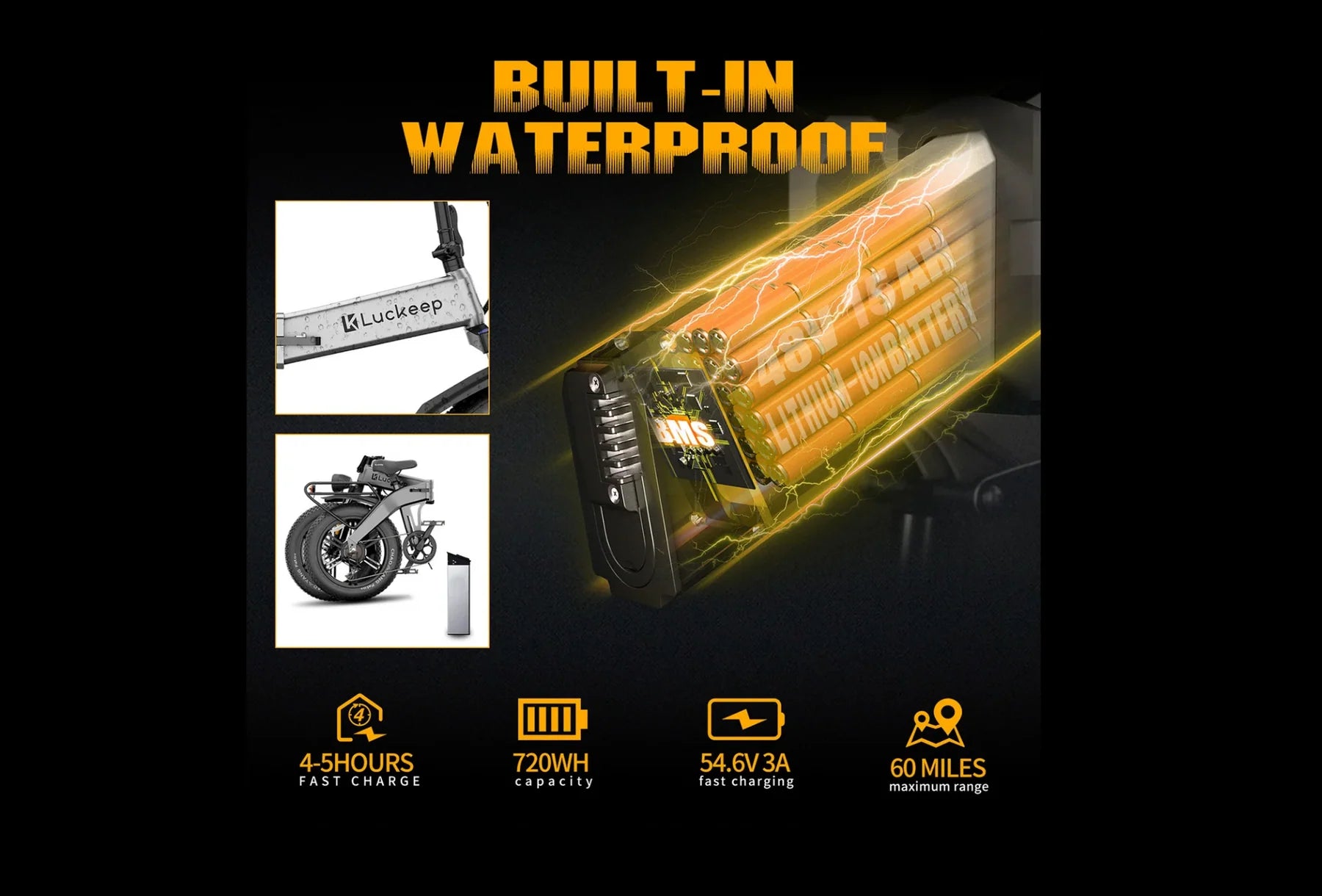 The X1 ebike features a Safety Certified Battery (UL2849 Standard) with a capacity of 720Wh. It only takes 4 hours to fully charge the battery